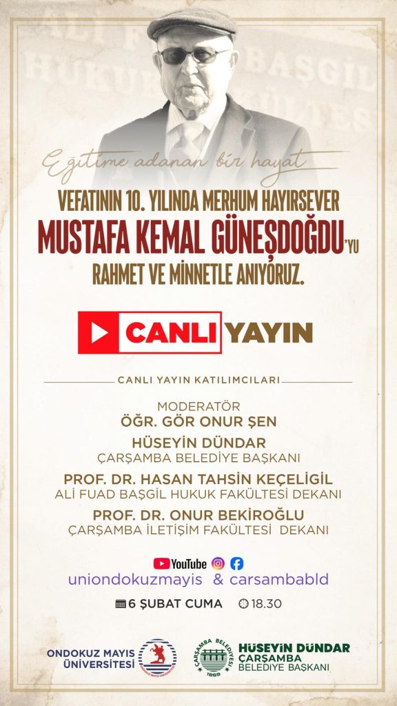 İletişim Fakültesi Öğr. Gör. Onur Şen’in moderatörlüğünü yapacağı canlı yayına; Çarşamba Belediye Başkanı Hüseyin Dündar, Hukuk Fakültesi Dekanı Prof. Dr. Hasan Tahsin Keçeligil ve İletişim Fakültesi Dekanı Prof. Dr. Onur Bekiroğlu konuşmacı olarak katılacak. Yayında, Güneşdoğdu’nun eğitime katkıları ve mirası konuşulacak.