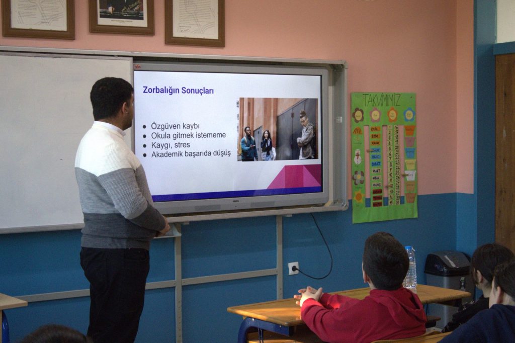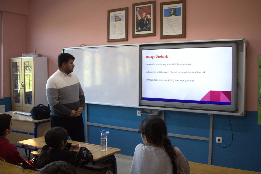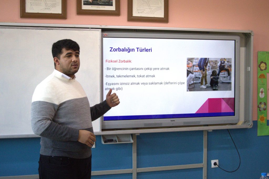 Karataş, öğrencilere zorbalığın tanımını, çeşitlerini ve türlerini anlattı. Zorbalık yapan ve zorbalığa maruz kalan kişilerin süreç boyunca hangi duygular içinde olduğunu açıkladı. Karataş, zorbalığa şahit olanların bu durumda nasıl davranması gerektiğine de değindi.