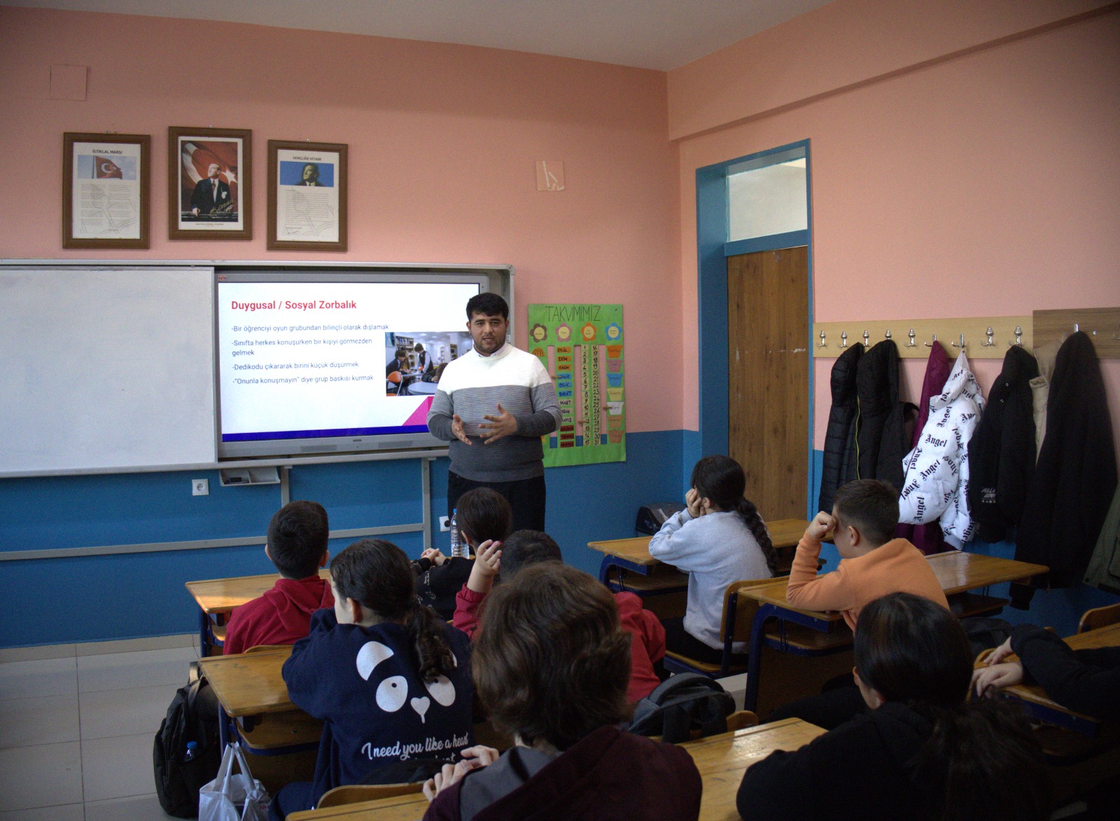 Karataş, öğrencilere zorbalığın tanımını, çeşitlerini ve türlerini anlattı. Zorbalık yapan ve zorbalığa maruz kalan kişilerin süreç boyunca hangi duygular içinde olduğunu açıkladı. Karataş, zorbalığa şahit olanların bu durumda nasıl davranması gerektiğine de değindi.