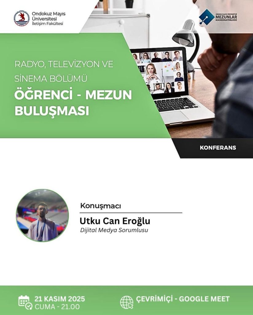 Ondokuz Mayıs Üniversitesi (OMÜ) İletişim Fakültesi Radyo, Televizyon ve Sinema Bölümü mezunları ile öğrencilerini bir araya getiren “Mezun-Öğrenci Buluşmaları” kapsamında çevrim içi söyleşi gerçekleştirildi. Bölümün 2022 mezunu Utku Can Eroğlu, konuşmacı olarak katıldığı etkinlikte profesyonel iş yaşamına dair deneyimlerini öğrencilerle paylaştı. Öğrencilerin yoğun ilgi gösterdiği söyleşiye bölüm öğretim üyeleri Prof. Dr. Nursel Bolat, Prof. Dr. Ahmet Oktan ve Doç. Dr. Murat Şahin de katıldı. Moderatörlüğünü Arş. Gör. Dr. Ayşegül Yücekök’ün üstlendiği etkinlik, Utku Can Eroğlu ve öğrenciler arasında gerçekleşen karşılıklı soru-cevaplarla devam etti.
