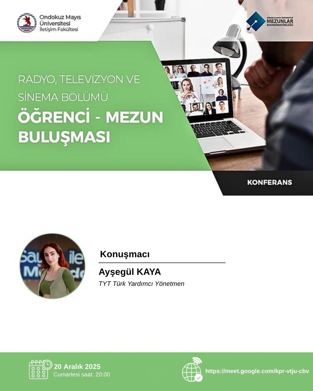 Ondokuz Mayıs Üniversitesi (OMÜ) İletişim Fakültesi Radyo, Televizyon ve Sinema Bölümü mezunları ile öğrencilerini bir araya getiren “Mezun-Öğrenci Buluşmalarının” ikincisi çevrim içi ortamda gerçekleştirildi. Bölümün mezunlarından Ayşegül Kaya, konuşmacı olarak katıldığı etkinlikte profesyonel iş yaşamına dair deneyimlerini öğrencilerle paylaştı.